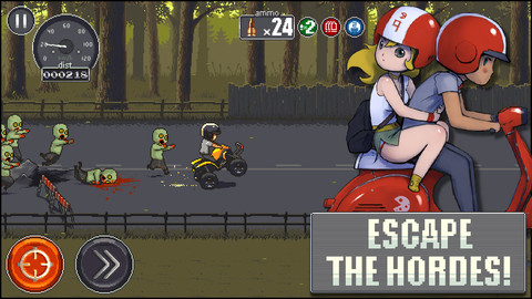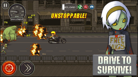 作为一款动作类型休闲小游戏,玩家在游戏中将控制一名摩托车手,一路狂飙冲出僵尸的围追堵截。在逃跑过程中你需要开动脑筋,巧妙利用路上的障碍和车辆减缓僵尸的前进速度,当然,光逃跑自然是不够刺激了,你还可以边开摩托边向僵尸射击。