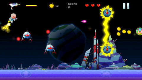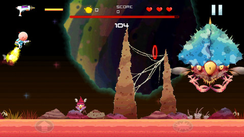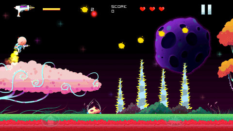 玩法乍一看还以为又是令人犯困的无尽跑酷,实则是有关卡一说,在游戏中玩家将历经 3 大世界,关卡总数超过 30 个,虽说数量不多,但难度可不小。此外游戏并没有任何内购,因此想要打穿游戏也只能是一步一个脚印。在第一世界中系统会简单提示相关操作,按住左下角的上升按键可以让主角向上飞行,松手即自由下落,点击右下角的按钮则是掏出太空枪向前射击,归纳来讲其实就和《Jetpack Joyride》(疯狂喷气机)差不多,只不过炮弹变成了横向自主发射,不过就自由度和生存率而言要比前者高一些。