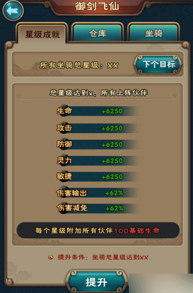 坐骑星级成就:根据所收集到的坐骑星级总和,即可在星级成就界面提升成就,从而加强所有上阵伙伴的各项属性值。