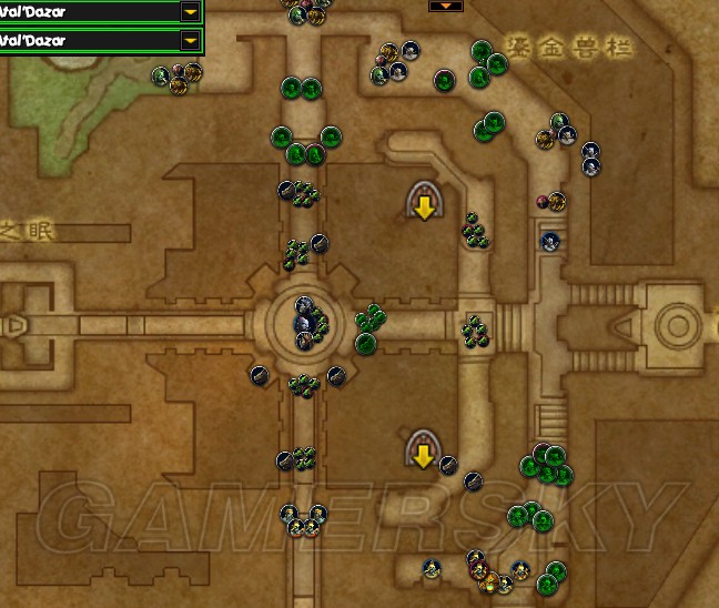 第一波打完后中间台子注意祭司。常规技能噬血箭,治疗技能黑暗回复,特别注意戈霍恩之赐打断,打断CD可用破胆。注意两边桥上的110,站位靠外是会引到的!打完之后观察中间两个台子上怪的数量,挑选数量少的一边走。台子上有个祭祀注意打断,中间的亵渎之灵残血使会读一个可打断的条,注意打断。