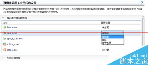 3、在你想要切换独立显卡的程序后面的下拉列表选择“高性能”如图所示